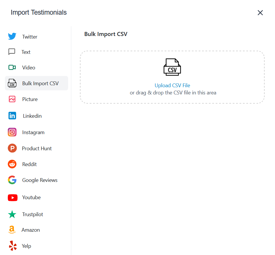 Also ensure that if you're importing testimonials from platforms like X, Linkedin etc in bulk then have a separate column to map to "testimonial\_type" in Famewall (possible values listed below). Otherwise the testimonials will be imported as text testimonials