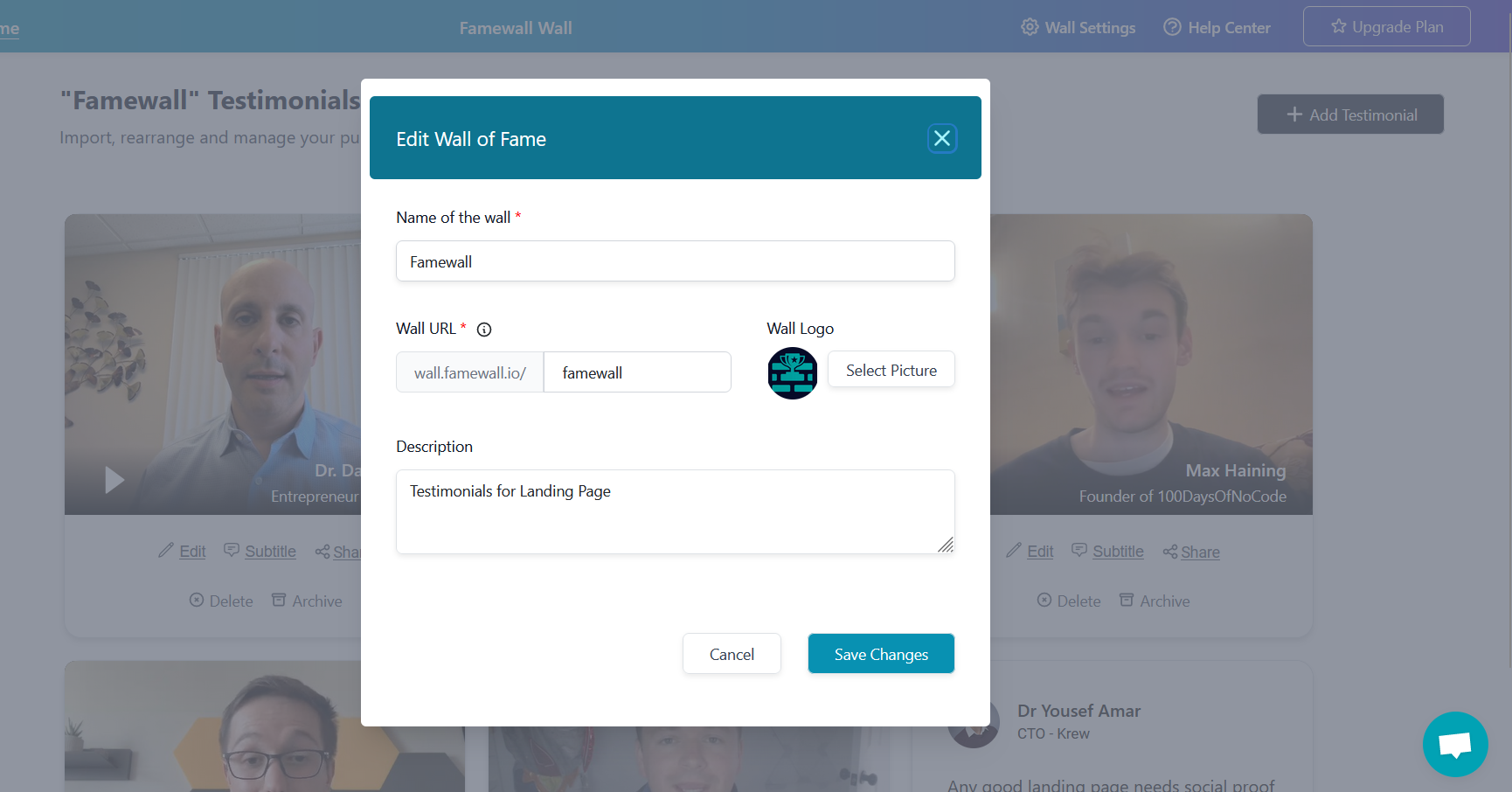 This would open up the modal where you can edit the testimonial wall details and you can hit save to finish the edits