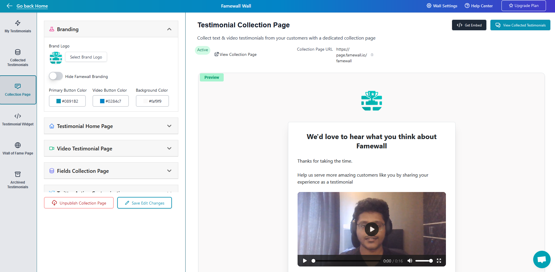 To get started head over to your Testimonial wall and select the wall then head over to "Collection Page" tab&#x20;