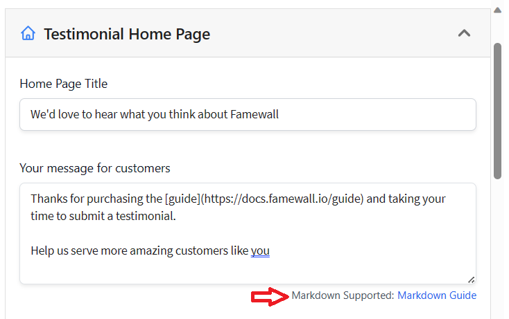 Then you'd be able to find "Your Message for Customers" & "Thank You Message" fields which would have the message 'Markdown supported'